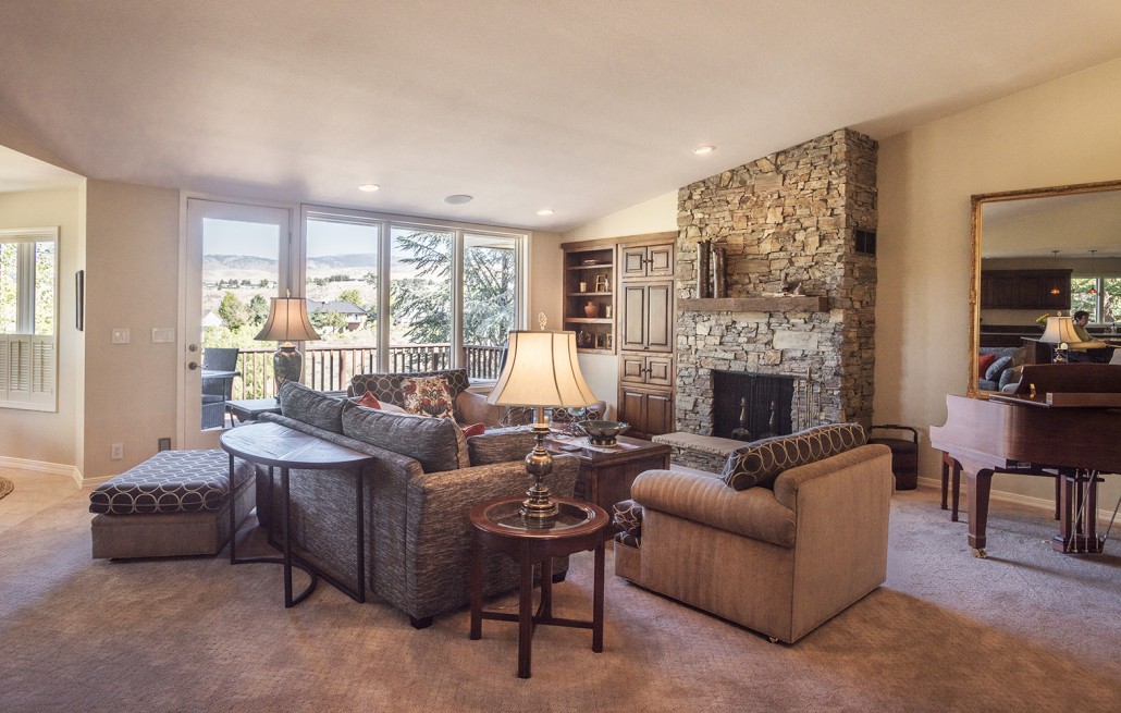 Since their home’s layout ensured that our clients’ daily activities could be lived out almost exclusively on its main level, we made the kitchen and living room our remodel focal points, giving the combined space a “great room” feel. Aside from all new fixtures, appliances and cabinetry, the only change we made to the kitchen was to modify the island counter to provide more optimal seating. Since our clients liked the tile flooring in the kitchen, new cabinetry was selected to better compliment its color scheme. The only major structural change in the course of the project was the demolition of the previous living room fireplace, which was a cozy little brick structure with a white wooden mantel, and the creation of a floor to ceiling stone fireplace that added a sense of drama — and did justice to its foothills view. Along with repainting every room and replacing carpeting throughout, we also added new lighting and bathroom fixtures, while Amy Snow worked with our clients on finishes and accents that included decorative beams for a more masculine feel to the study.