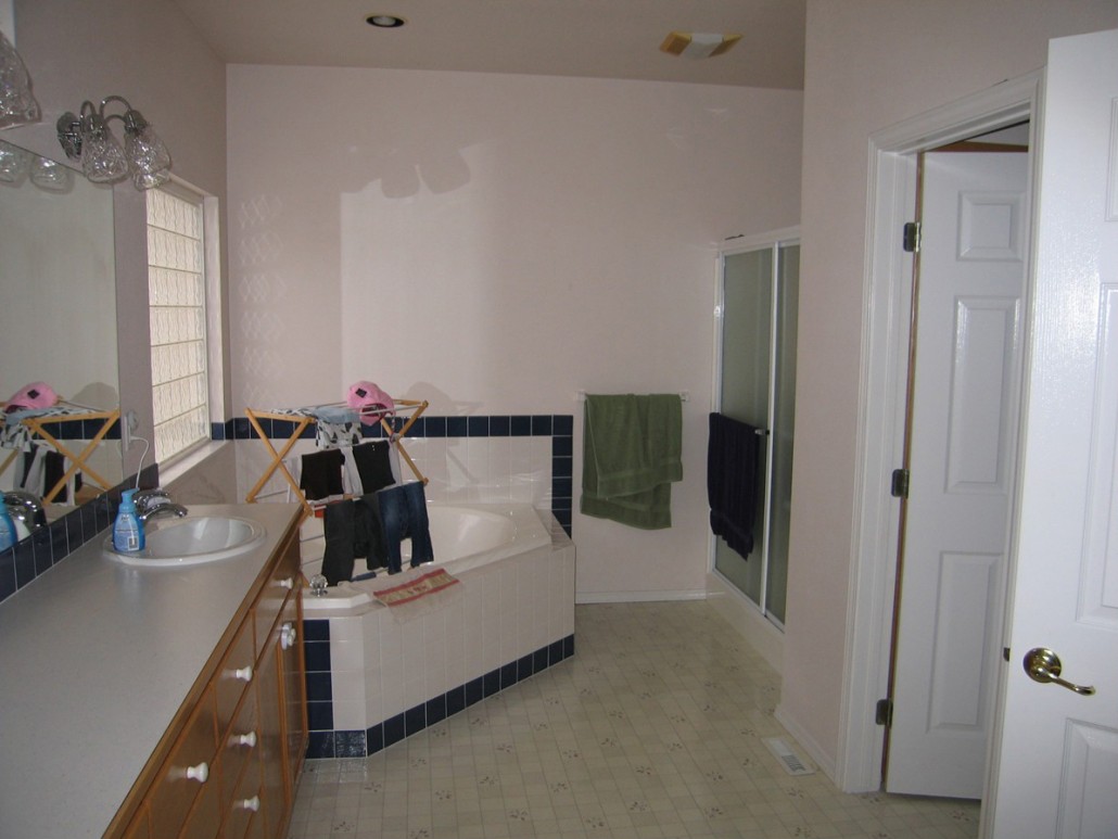 We achieved our twin objectives of an improved bathroom layout and the addition of a laundry room by bumping the bathroom wall out into the garage area, then moving the wall between the bathroom and the hallway to create the laundry room space. In the bathroom itself we removed a spa tub (typically used as a clothes drying area), and added a frameless shower where the tub had been, while keeping the existing plumbing from the original shower in place. For privacy, we patched over the window that had formerly looked on the tub and added a smaller one above the new shower area to let in natural light. By increasing the size of the shower, we were able to add a second shower head on a slider bar, so it could now be used to wash the dog. We also redid the toilet room.