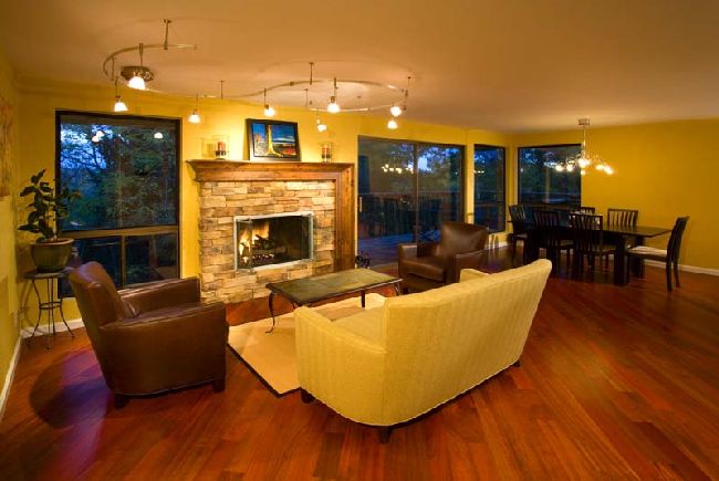 A new fireplace facade, replacing the carpet with hardwood flooring, new windows, designer lighting, and bold color took this room from drab to dramatic in short order.