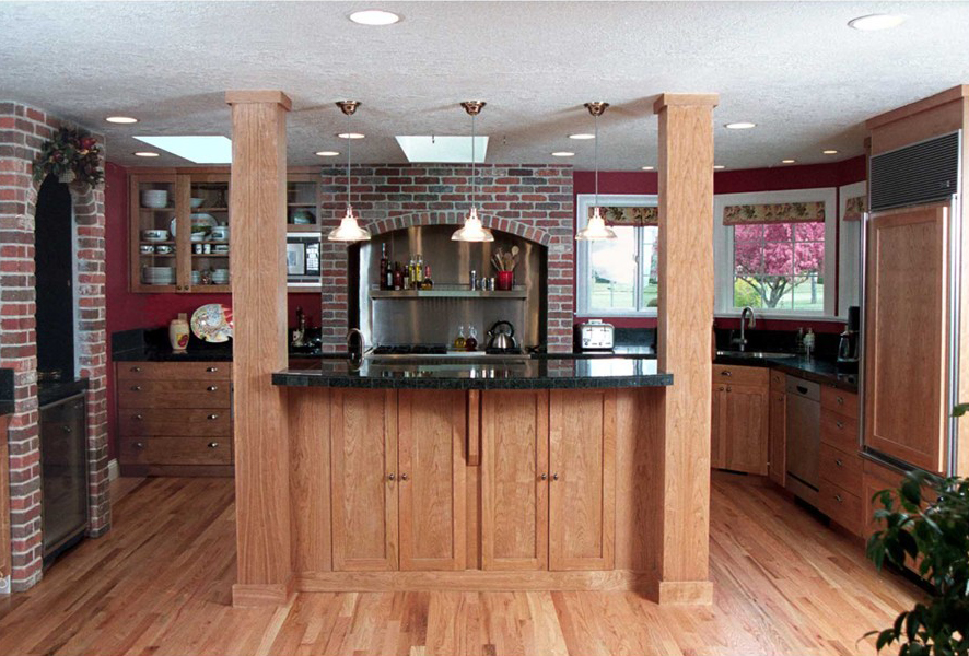 The goal of this kitchen remodel was to increase its size and give it a u-shaped layout that would include a large combination food prep area and counter as its centerpiece. We also wanted to update the look of the kitchen with new cabinetry and hardwood flooring, as well as tie in an existing brick accent by repeating it in a new space for the range and oven.