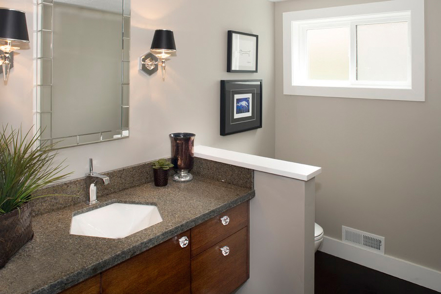 In place of the tub/shower unit, we installed a vanity. Where the original vanity was located, we installed a new toilet, and gave it a more discreet appearance (or lack of appearance) by constructing a pony wall.